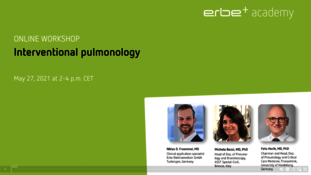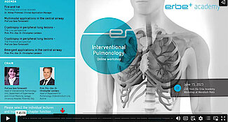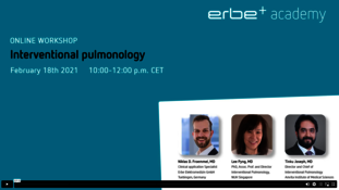 Webinar on Demand105 mins.Recording from the Erbe Academy workshop at Wendisch Rietz on June 15, 2023. Learn more about: Erbe technologies in IP, multimodal applications in the central airway, diagnostic applications in the peripheral lung and emergent central airway conditions. It includes lectures from our recent Erbe Academy's course on Interventional Pulmonology held by Dr. Niklas Frömmel (Clinical Application Manager at Erbe), Prof. ssa Sara Tomassetti (University Hospital Florence), Prim. Priv.-Doz. Dr. Christopher Lambers (Ordensklinikum Linz). Whether you missed the course or want to rewatch presentations, the Workshop on demand is a convenient platform.